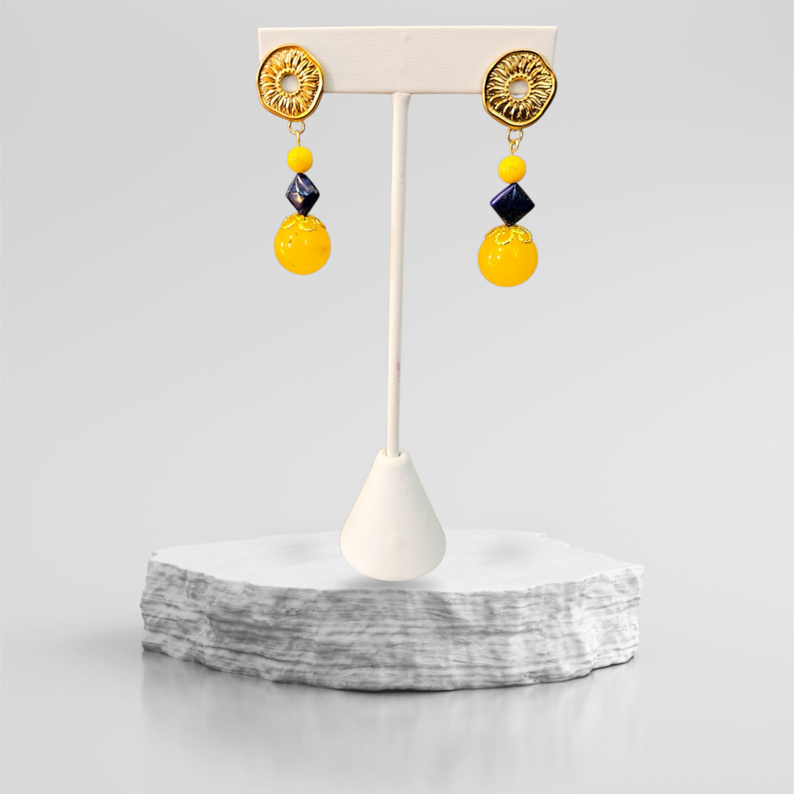 Plongez dans l’harmonie parfaite entre la chaleur du soleil et la profondeur de l’ébène avec les boucles d’oreilles Ébène Ensoleillée. Ce bijou sublime allie l’éclat doré d’un cercle finement ouvragé à la richesse d’une perle jaune vibrante, le tout suspendu à une forme géométrique en bois sombre. Chaque élément s’équilibre pour créer une pièce à la fois élégante et audacieuse, comme un rayon de lumière traversant une forêt mystérieuse.