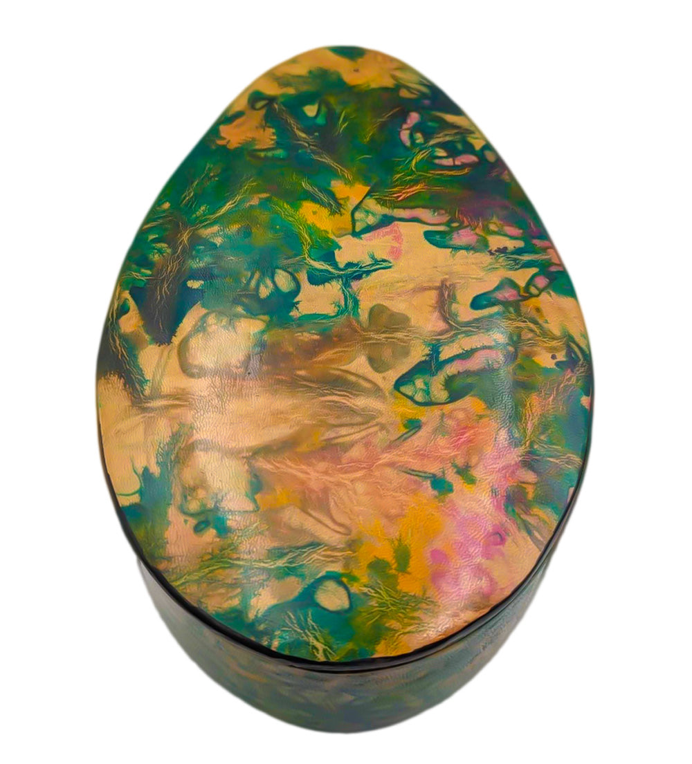 Cette belle boîte à bijoux est faite en cuir et à la main. Des beaux motifs décorent le couvercle de la boîte.