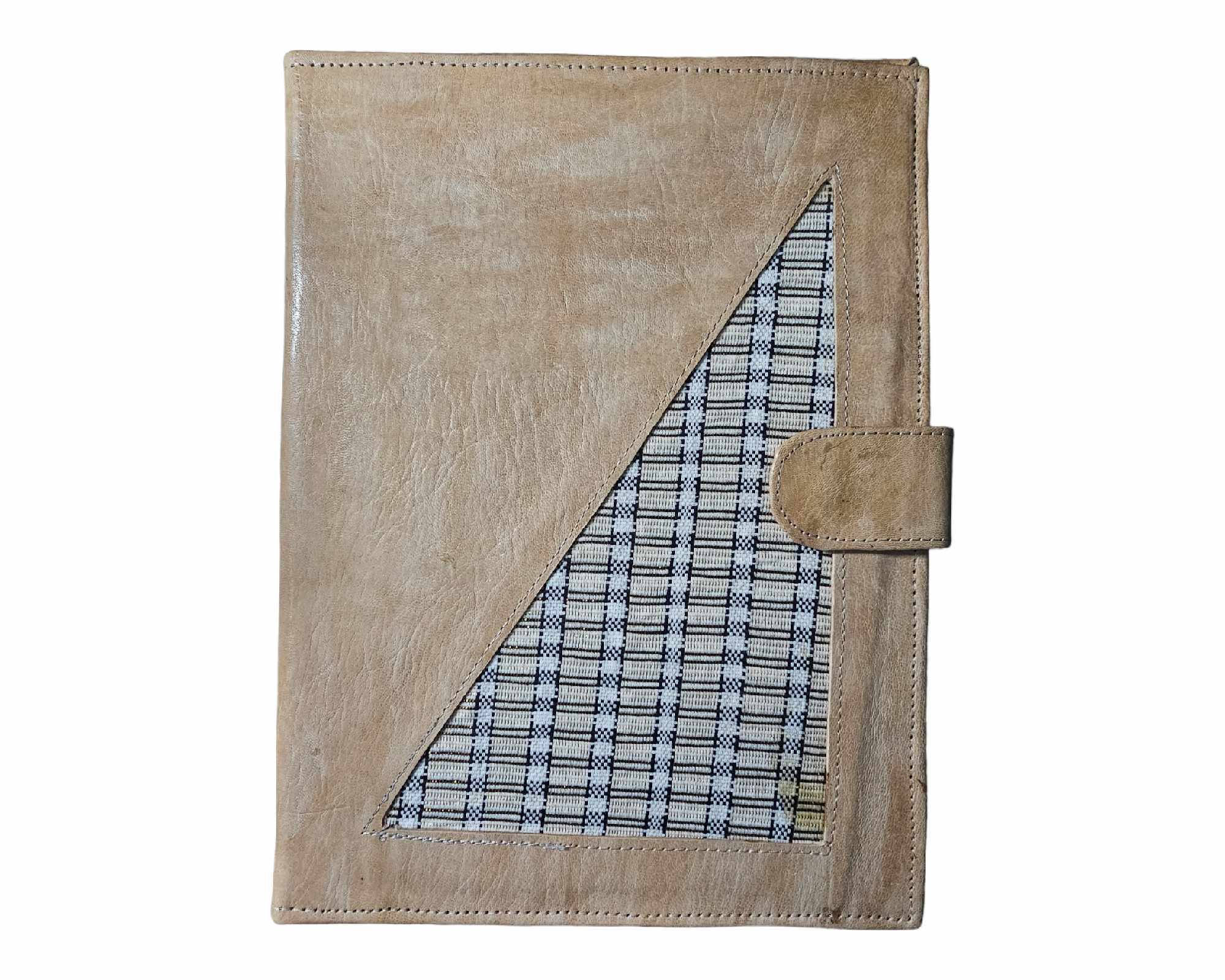 Porte document artisanal fabriqué en cuir et en pagne dans un format A4.